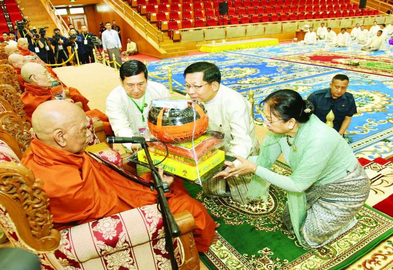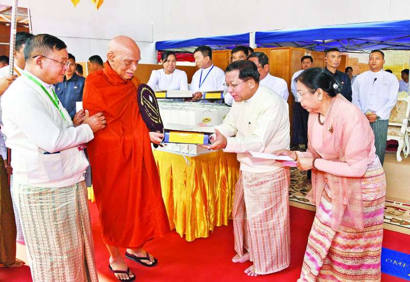 ၂၀၂၆ ခုနှစ်၊ သာသနာတော်ဆိုင်ရာ ဘွဲ့တံဆိပ်တော် ဆက်ကပ်ခံယူတော်မူမည့် ဆရာတော်ကြီးများအား နေ့ဆွမ်းဆက်ကပ်လှူဒါန်းခြင်းကို ယနေ့နံနက်ပိုင်းတွင် နေပြည်တော်၊ မာရဝိဇယဗုဒ္ဓဥယျာဉ်တော်ပရိဝုဏ်အတွင်းရှိ အဂ္ဂါဓိပတိသာသနာ့ဗိမာန်တော်ကြီး၌ ကျင်းပရာ ပြည်ထောင်စုသမ္မတမြန်မာနိုင်ငံတော်ယာယီသမ္မတ နိုင်ငံတော်လုံခြုံရေးနှင့်အေးချမ်းသာယာရေးကော်မရှင်ဥက္ကဋ္ဌ ဗိုလ်ချုပ်မှူးကြီး မင်းအောင်လှိုင်နှင့် ဇနီး ဒေါ်ကြူကြူလှတို့ တက်ရောက်၍ နေ့ဆွမ်းဆက်ကပ်လှူဒါန်းသည်။
