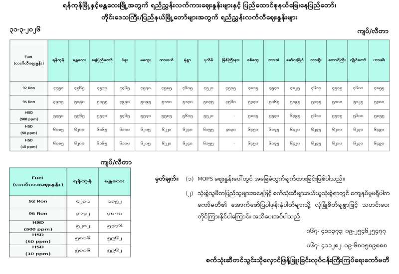 ရန်ကုန်မြို့နှင့် မန္တလေးမြို့အတွက် ရည်ညွှန်းလက်ကားဈေးနှုန်းများနှင့် ပြည်ထောင်စုနယ်မြေ နေပြည်တော်၊ တိုင်းဒေသကြီး/ပြည်နယ် မြို့တော်များအတွက် ရည်ညွှန်းလက်လီဈေးနှုန်းများ